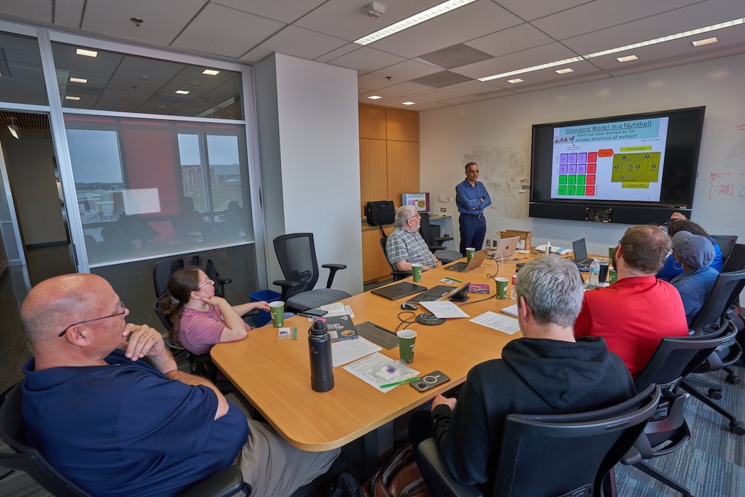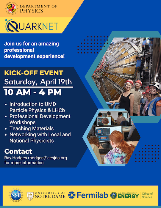 The LHCb group at the University of Maryland launched a new Quarknet center on Saturday, April 19, 2025 with a kickoff event. Recruitment started in March led by Ray Hodges, a high school teacher at Charles E Smith Jewish Day School in Rockville, MD. He sent the attached flier to contacts in the public school systems of the Montgomery and Prince George’s counties, as well as to the Association of Independent Maryland & DC Schools. A total of six high school teachers attended.